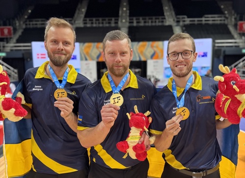 Pontus Andersson tillsammans med James Blomgren och Joachim Karlsson Rosén vid VM-guldet i 3-manna 2025.